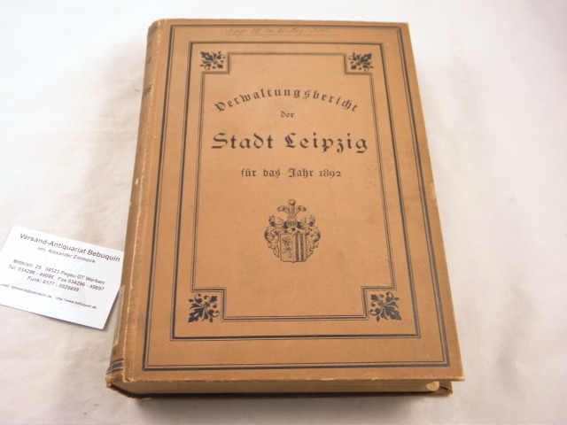 LEIPZIG.– VERWALTUNGSBERICHT DES RATHES DER STADT LEIPZIG FÜR DAS JAHR 1892.– Leipzig (Duncker & Humblot), 1894. 4°. IV, 847 S. ill. OLn mit Schwarzprägung. makuliertes Bibliotheksex., gut erhalten.
