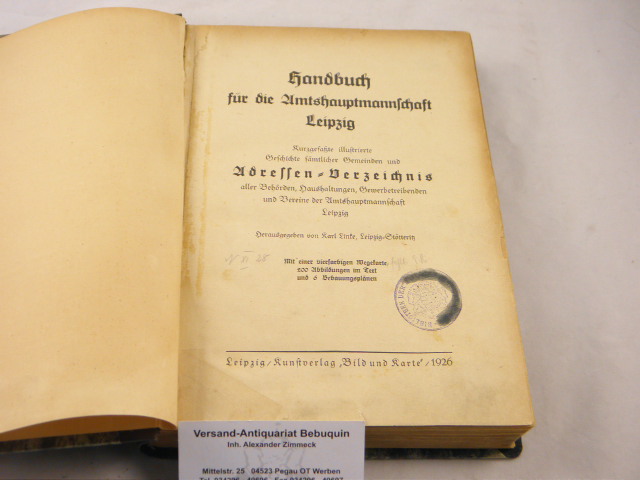 LEIPZIG.– LINKE, Karl: (Hrsg.) Handbuch für die Amtsmannschaft Leipzig. Kurzgefaßte illustrierte Geschichte sämtlicher Gemeinden und Adressen-Verzeichnis aller Behörden, Haushaltungen, Gewerbetreibenden und Vereine der Amtahauptmannschaft Leipzig. Leipzig (Bild und Karte), 1926. Gr. 8°. VIII, 484 S. mit 200 Textabb. + 6 teils gefalteten Bebauungsplänen. HLn der Zeit. makuliertes Bibliotheksex., es fehlt die beiliegende Wegekarte. EA.