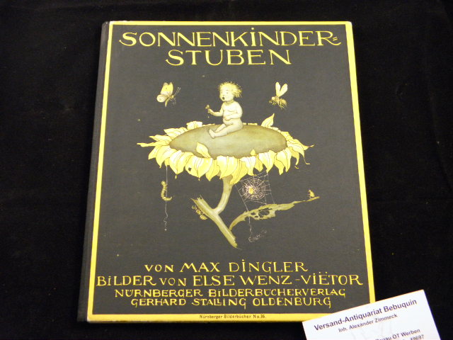 WENZ-VIETOR.– DINGLER, Max: Sonnenkinderstube. 12. Aufl. Oldenburg (Stalling), ca 1944. Gr. 8°. 12 Bl. mit 13 farb. Bildtafeln von Else Wenz-Vietor und den Schmetterlingsvorsatzpapieren. farb. ill. OHLn. mit OUmschl. Umschlag am Rücken etwas lädiert, innen nur leicht gebräunt, insgesamt gut. = Nürnberger Bilderbücher Nr. 36. letzte Auflage (Museum im Schloß 35; vergl. Klotz 1070/13)