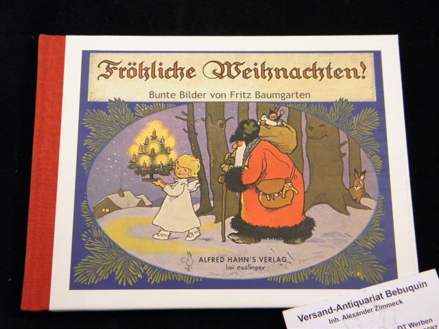 BAUMGARTEN, Fritz: Fröhliche Weihnachten! Bunte Bilder. 3. Aufl. Esslingen (Schreiber), 2009. Quer 8°. 10 Bl. mit 8 farb. Bildtafeln von Fritz Baumgarten. farb. ill. OHLn. wie neu Diese erstmals überarbeitete Auflage bedient sich der Ausgabe von 1927, die allerdings zum Ausmalen war. Blaume 84.