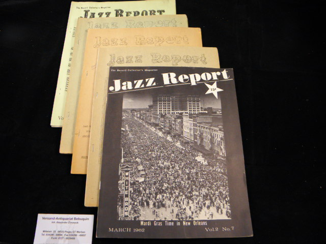JAZZ.– JAZZ REPORT.– The Records Collectors Magazin. Hrsg. von Paul E. Affeldt. 5 Hefte. Leighton Calif. (Ventura), 1962 ff. 4°. jeweils ca 40 S. mit Abb. ill. OKart. etwas bestaubt Hier die Hefte Vol 2 No 7, Vol 5 No 3, Vol 6 No 2 + 3, Vol 7 No 5 für zusammen