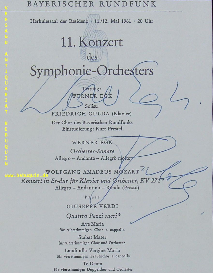 EGK, Werner (Dirigent) + GULDA, Friedrich (Pianist): eigenhändig von beiden signierte Programmseite. München (Philharmonie), 11.5.1961. 16,5 x 13 cm. 1 Bl. + Doppelblatt „Werner Egk. Versuch eines Portraits“ von Erich Valentin. Zum 60. Geburtstag am 17. Mai. Werner Egk (* 17. Mai 1901 in Auchsesheim bei Donauwörth; † 10. Juli 1983 in Inning am Ammersee; eigentlich Werner Joseph Mayer) war ein deutscher Komponist. Friedrich Gulda (* 16. Mai 1930 in Wien; † 27. Jänner 2000 in Weißenbach am Attersee) war ein österreichischer Pianist und Komponist. (Wikipedia)