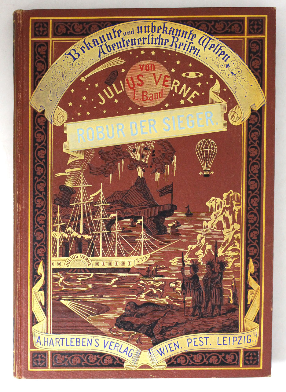 VERNE, Julius: Robur der Sieger. Wien (Hartleben), 1887. Gr. 8°. 223 (4) S. mit 45 Illustrationen. OLn. mit reicher Gold- und Schwarzprägung und Farbschnitt. StaT, Ex libris, sehr schönes Ex. = Bekannte und unbekannte Welten, Bd. 50. dt. EA. Prachtausgabe. Fromm 26376.