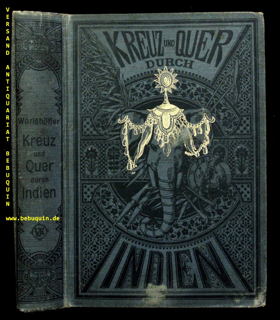 WÖRISHÖFFER, S.: Kreuz und quer durch Indien. Irrfahrten zweier junger deutscher Leichtmatrosen in der Indischen Wunderwelt. 6. Aufl. Bielefeld (V&K), 1912. Gr. 8°. 629 S. mit 16 Vollbildern und Aquarell Titelbild von J. Gehrts und gestalteten Vorsatzpapieren. reich verziertes OLn mit goldgeprägtem Elefanten. Einband leicht angeschmutzt, leicht schief gelesen. insgesamt schönes Ex. Klotz 8410/30.