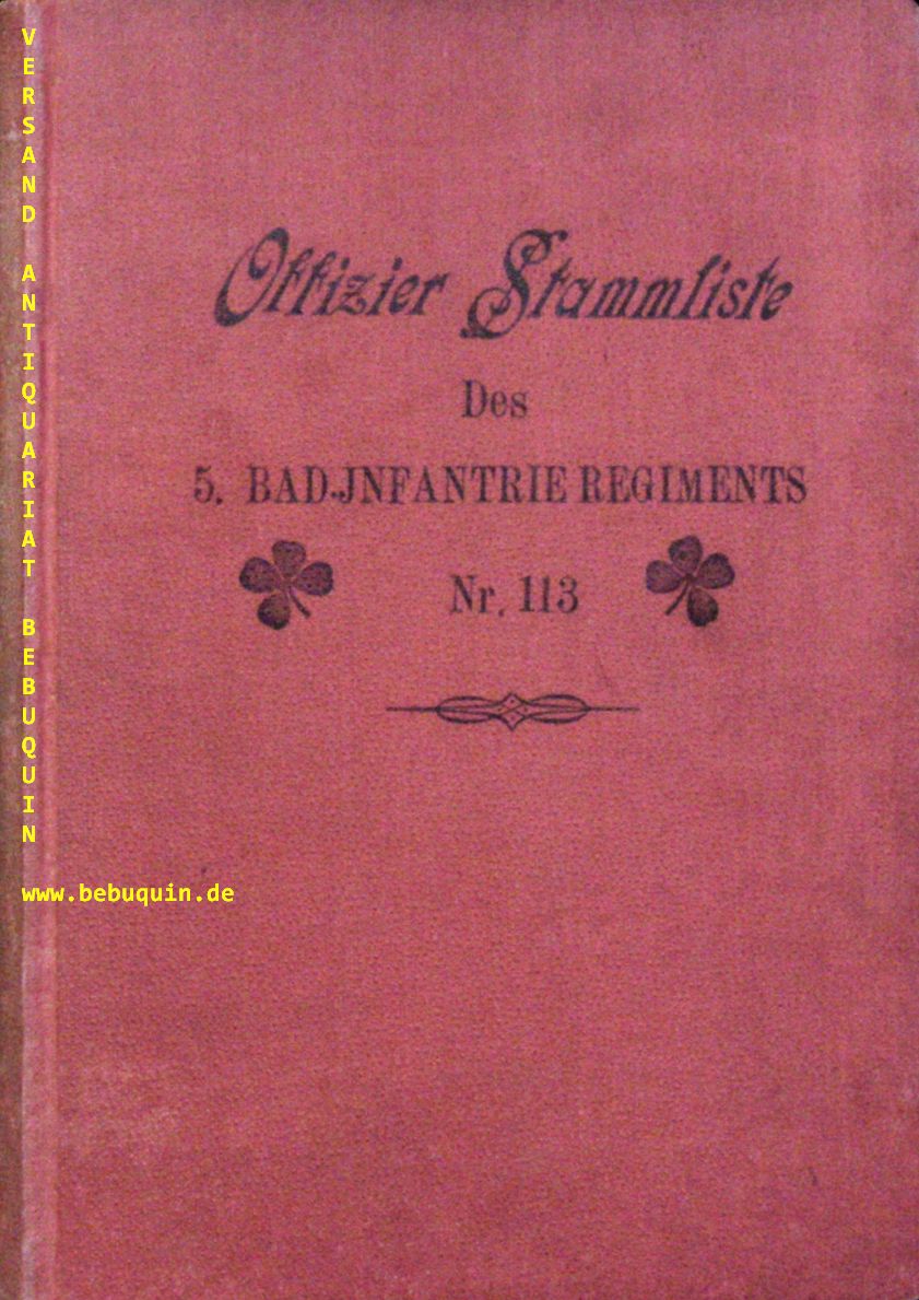 REGIMENTER.– LANZENAUER, Haehlling von: Offizier-Stamliste des 5. Badischen Infanterien-Regiments Nr. 113 und seines Stamm-Bataillons des Großherzoglich Badischen 3. Füsilier-Bataillons. Abgeschlossen am 15. Juni 1904. Berlin. Berlin (Mittler), 1904. Gr. 8°. XII, 344 (1) S. ill. OLn. mit einer original Widmung zum Gewinn des III. Platzes beim Kaiserschießen 1903. EA.