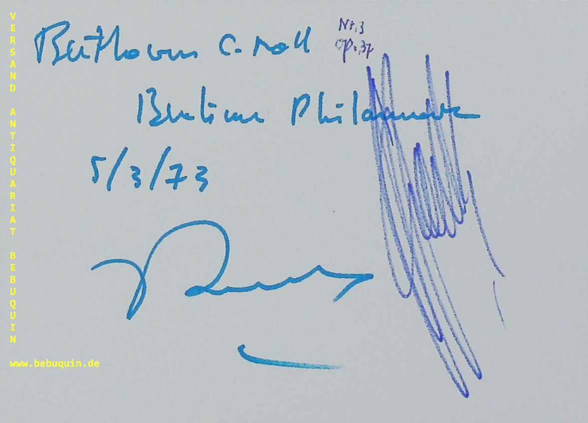 KARAJAN, Herbert von (Dirigent) + POMMIER, Jean-Bernard (Pianist): eigenhändig mit blauem Stift signiertes Autogrammblatt. Mit Berliner Philharmonikern. Berlin, 5.3.1973. 10,5 x 14,5 cm. große Karteikarte mit Programheft beiliegend. tadellos. Herbert von Karajan (* 5. April 1908 in Salzburg; † 16. Juli 1989 in Anif, Salzburg; geboren als Heribert Ritter von Karajan, in Österreich ab 1919 amtlich Heribert Karajan) war ein österreichischer Dirigent. Als solcher zählt er zu den bekanntesten und bedeutendsten des 20. Jahrhunderts. Karajan arbeitete mit vielen angesehenen Symphonieorchestern, wirkte an bedeutenden Opernhäusern und veröffentlichte zahlreiche Einspielungen klassischer Musik. (Wikipedia)