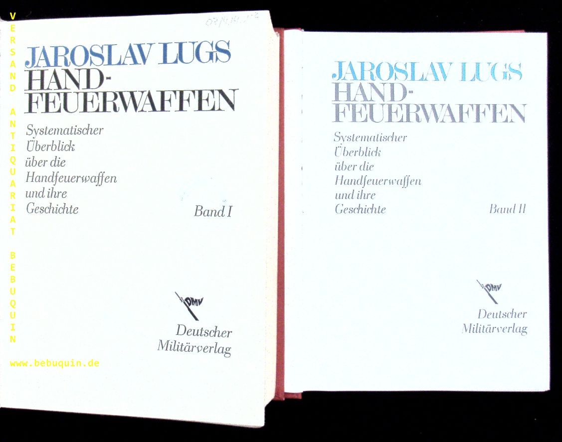 WAFFEN.– LUGS, Jaroslav: Handfeuerwaffen. Systematischer Überblick über die Handfeuerwaffen und ihre Geschichte. D.v. Rudolf Winkler. 2. erweiterte Aufl. 2 Bände. Berlin (Militär), 1968. Gr. 8°. 763, 429 S. mit 1104 Bilder auf Tafeln. OLn. Ordnungsgemäß aus Bundeswehrbeständen ausgesondertes Bibliotheksexemplar (Stempel, Rückenschild).