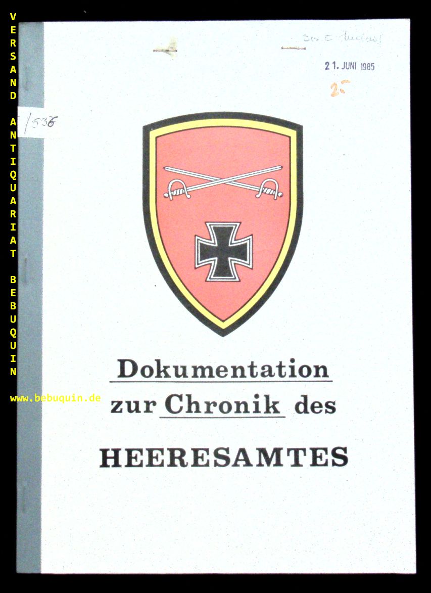 BECKMANN: Dokumentation zur Chronik des Heeresamtes. o.O. 1983. 4°. unpag. OBr. Ordnungsgemäß aus Bundeswehrbeständen ausgesondertes Bibliotheksexemplar (Rückenschild, Stempel). Titelseite an Umschlag geheftet. EA.