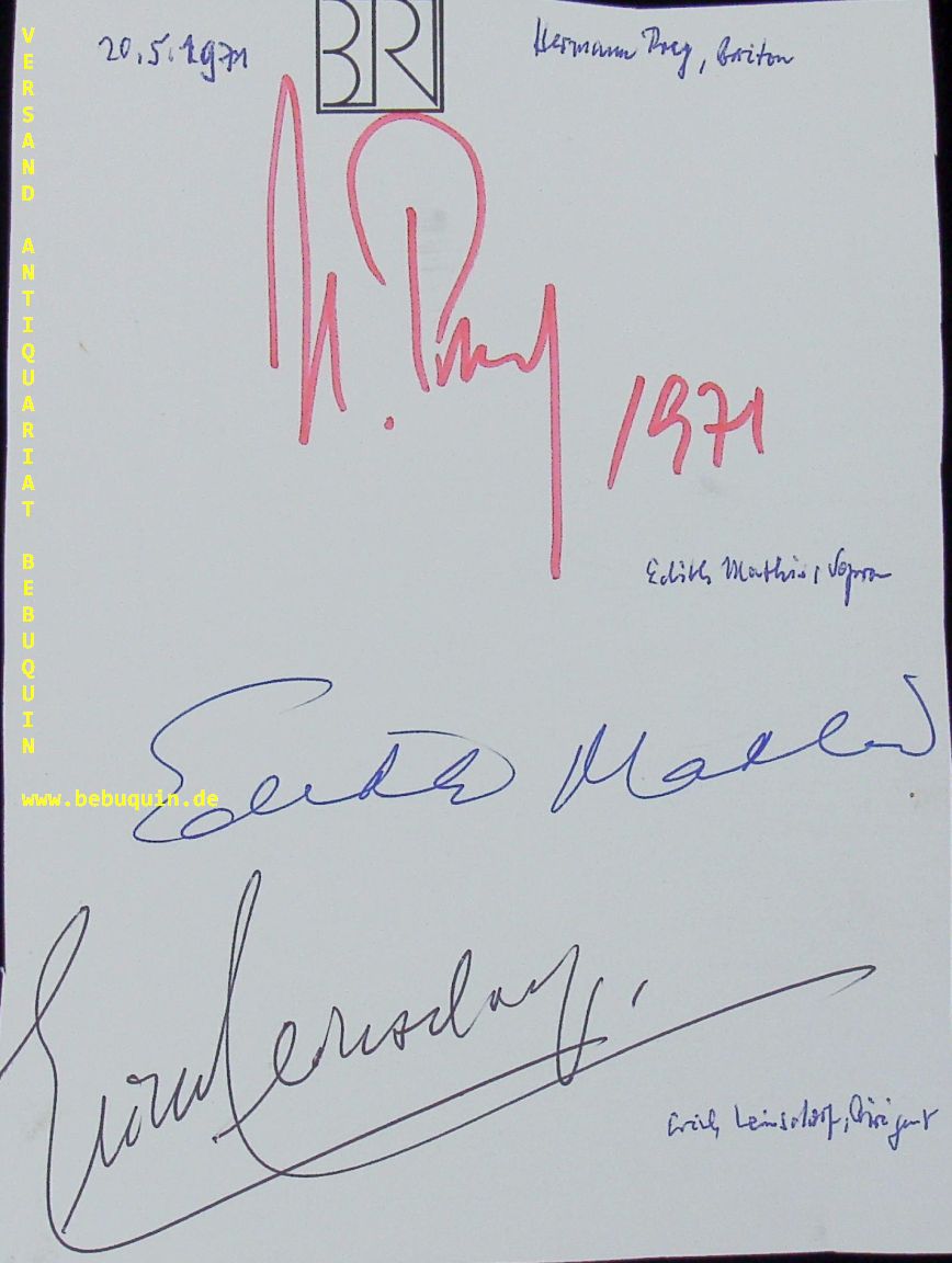 LEINSDORF, Erich (Dirigent) + PREY, Hermann (Tenor) + MATHIS, Edith (Sopran): Programmheftseite mit den drei eigenhändigen Signaturen. München (Philharmonie), 20.5.1971. 18 x 13,5 cm. 2 Bl. Erich Leinsdorf, geborener Erich Landauer (* 4. Februar 1912 in Wien; † 11. September 1993 in Zürich) war ein österreichisch-US-amerikanischer Dirigent, der ab 1937 vorwiegend in den Vereinigten Staaten lebte. Leinsdorf galt als typischer Operndirigent und wurde in Amerika besonders als Wagner-Dirigent geschätzt.