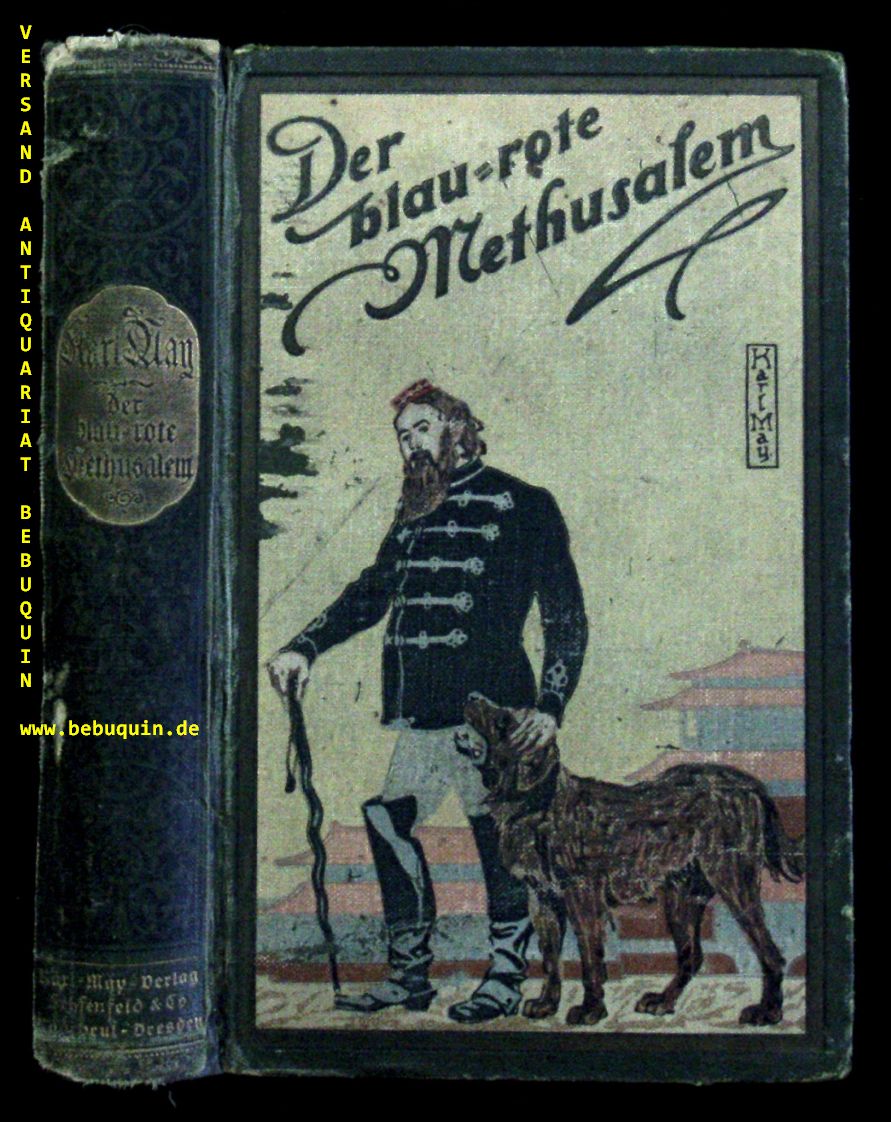 MAY, Karl: Der blaurote Methusalem. Eine lustige Studentenfahrt nach China. 16.– 22. Tsd. Radebeul (Karl May Stiftung), (1914). 2 Bl., 569 S., 1 Bl. mit gestalteten Vorsatzpapieren. farb. ill. OLn. BuchKanten berieben, Einband etwas angeschmutzt und berieben, Seiten teils am Rand etwas bestoßen, insgesamt noch ordentlich. = Gesammelte Werke, Bd. 40.