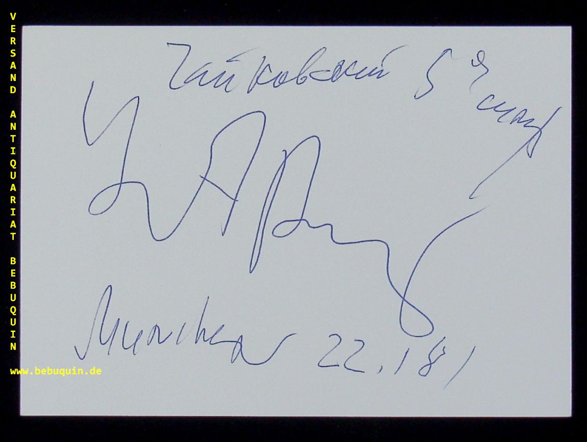 AHRONOVISCH, Yuri (Dirigent): eigenhändig signierte und datierte Autogrammkarte. München (Philharmonie), 22.1.1981. 10,5 x 14,5 cm. große Karteikarte. Juri Michailowitsch Aronowitsch (* 13. Mai 1932 in Leningrad; † 31. Oktober 2002 in Köln) war ein israelischer Dirigent russischer Herkunft. (Wikipedia)