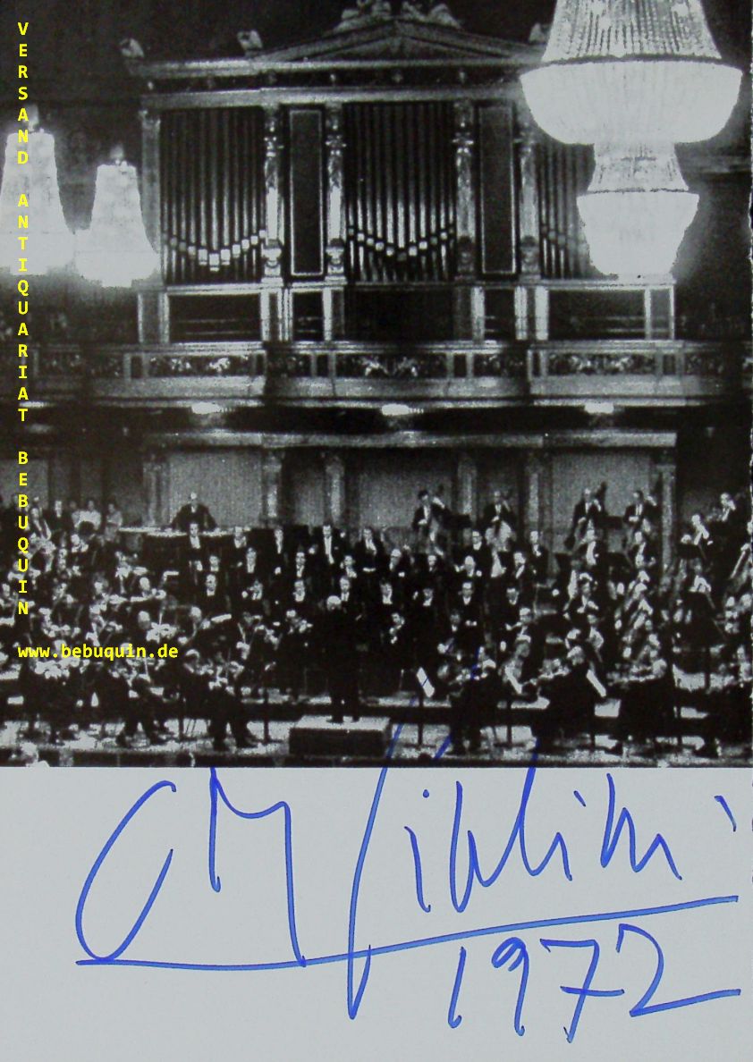 GIULINI, Carlo Maria (Dirigent): eigenhändig signierte und datierte Programmheftseite. München (Philharmonie), 1972. 2 Bl. mit Orchestertotale und Portrait. Carlo Maria Giulini (* 9. Mai 1914 in Barletta, Provinz Barletta-Andria-Trani; † 14. Juni 2005 in Brescia, Lombardei) war ein italienischer Dirigent. (Wikipedia)