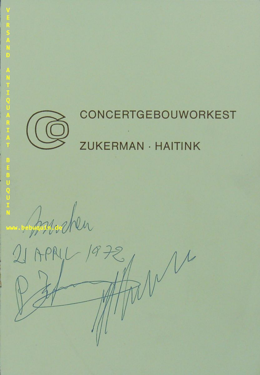 HAITINK, Bernard (Dirigent) + ZUKERMAN, Pinchas (Violinist): eigenhändig von beiden signierte und datierte Portraitseite. München (Philharmonie), 21.4.1972. 2 Bl. Bernard Johan Herman Haitink (* 4. März 1929 in Amsterdam) ist ein niederländischer Dirigent. Pinchas Zukerman (* 16. Juli 1948 in Tel Aviv) ist ein israelischer Violinist, Bratschist und Dirigent. (Wikipedia)