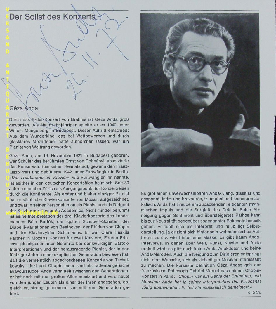 ANDA, Geza (Pianist): eigenhändig signierte und datierte Portraitseite. München (Philharmonie), 24.11.1972. 23 x 21 cm. 1 Bl. Géza Anda (* 19. November 1921 in Budapest, Ungarn; † 13. Juni 1976 in Zürich, Schweiz) war ein Schweizer Pianist ungarischer Herkunft. (Wikipedia)