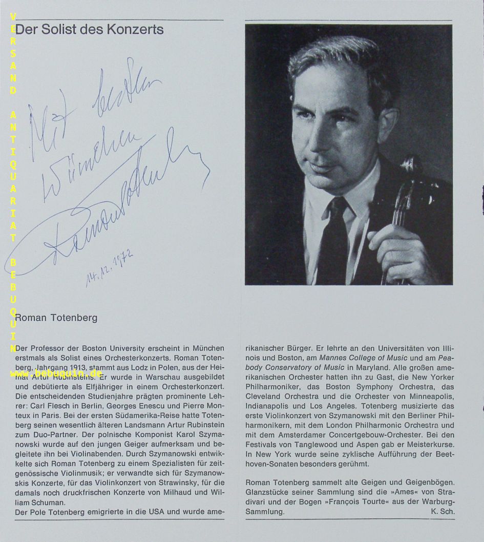 TOTENBERG, Roman (Violinist): eigenhändig signierte und datierte Portraitseite. München (Philharmonie), 14.12.1972. 23 x 21 cm. 1 Bl. Roman Totenberg (geboren 1. Januar 1911 in Lódz, Russisches Kaiserreich; gestorben 8. Mai 2012 in Newton, Massachusetts) war ein US-amerikanischer Violinist und Geigenlehrer polnisch-jüdischer Herkunft. (Wikipedia)