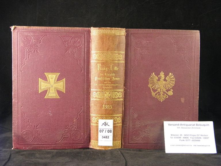 RANG- UND QUARTIER-LISTE DER KÖNIGLICH PREUSSISCHEN ARMEE UND DES XIII. (Königlich Württembergischen) ARMEEKORPS FÜR 1896.– Mit den Anciennetäts-Listen der Generalität und der Stabsoffiziere. Berlin (Mittler), 1.5.1895 XXIV, 1281 (5) S. dunkelweinroter OLn mit Blindprägung und goldgeprägtem Reichsadler (vorn) und Kreuz (hinten) sowie goldgeprägtem Rücken und den Reichsadler-Vorsätzen.