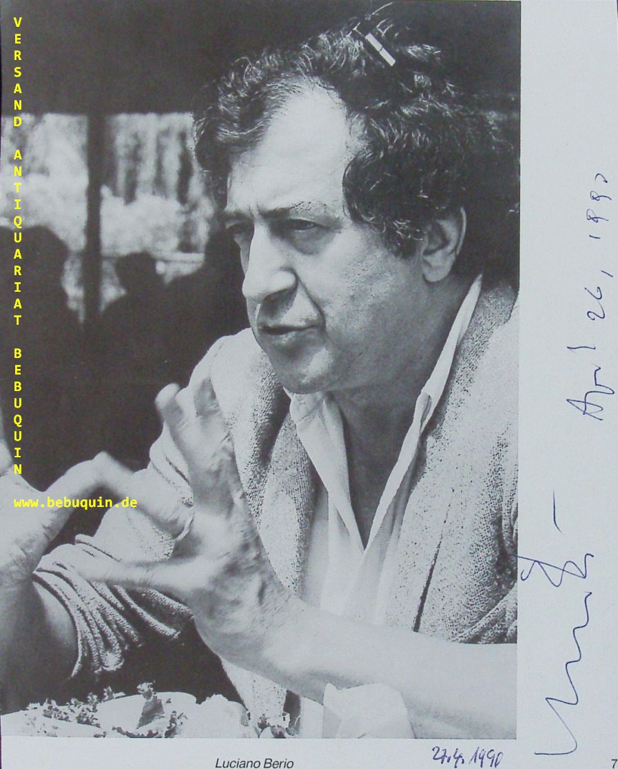 BERIO, Luciano (Komponist, Dirigent): eigenhändig signierte und datierte Portraiseite. München (Herkulessaal), 26.4.1990. 19 x 15,5 cm. 1 Bl. Luciano Berio (* 24. Oktober 1925 in Oneglia; † 27. Mai 2003 in Rom) war ein italienischer Komponist, bekannt für seine experimentellen Kompositionen und als einer der Pioniere der elektronischen Musik. (Wikipedia)