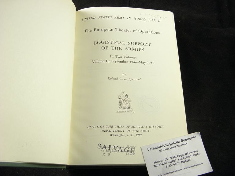 2. WELTKRIEG.– RUPPENTHAL, Roland G.: The European Theater of Operations. Logistical Support of the Armies. Vol II: September 1944 – May 1945. Washington (Office of the Chief of Military History), 1959. Gr. 8°. XVI, 540 S. mit zahlr. Abb. grünes OLn mit goldgeprägter Deckelvignette. Ordnungsgemäß aus Bundeswehrbeständen ausgesondertes Bibliotheksexemplar (Stempel, Rückenschild). = United States Army in World War II. EA.