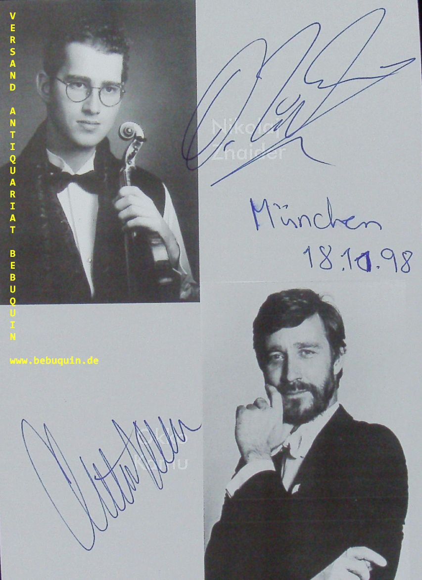 KAMU, Okko (Dirigent) + ZNAIDER, Nikolaj (Violinist): eigenhändig von beiden signierte Portraitseite. München (Herkulessaal), 18.10.1998. 17,5 x 12,5 cm. 1 Bl. Okko Tapani Kamu (* 7. März 1946 in Helsinki) ist ein finnischer Dirigent. Nikolaj Szeps-Znaider (* 5. Juli 1975 in Kopenhagen) ist ein dänischer Geigenvirtuose und Dirigent. Er verwendete früher den Künstlernamen Nikolaj Znaider. (Wikipedia)