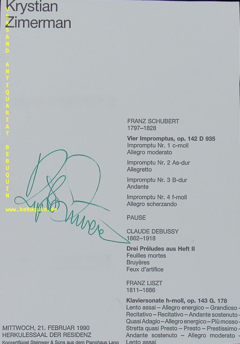 ZIMERMAN, Krystian (Pianist): eigenhändig signierte und datierte Programmseite. München (Philharmonie), 21.2.1990. 19 x 13 cm. 1 Bl. Krystian Zimerman (* 5. Dezember 1956 in Zabrze, Polen) ist ein polnischer Pianist. Seit 1996 lebt Krystian Zimerman mit seiner Familie in Basel, wo er eine Meisterklasse an der Musikhochschule Basel leitet. Im April 2009 sorgte er für einen Eklat während eines Konzerts in den Vereinigten Staaten, als er von der Bühne in Bezug auf den amerikanischen Raketenschild in Polen forderte: Get your hands off my country („Lassen Sie Ihre Hände von meinem Land“). Diese Äußerung war möglicherweise auch persönlich motiviert, da Zimermans Steinway-Flügel acht Jahre zuvor, kurz nach den Terroranschlägen des 11. September bei der Einreise in die USA wegen Terrorverdachts vom Zoll konfisziert und vernichtet wurde. (Wikipedia)