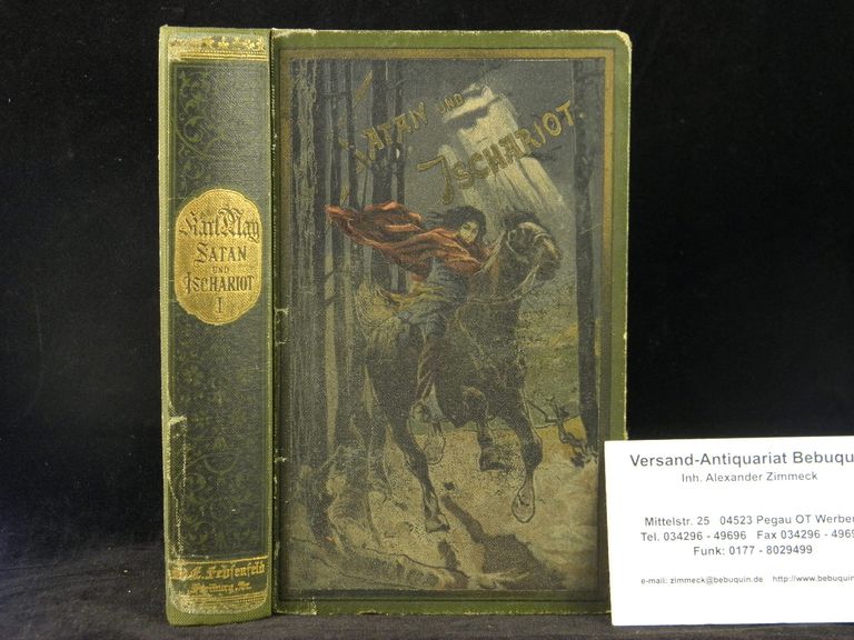 MAY, Karl: Satan und Ischariot. I. Band. Reiseerzählungen. 31.– 35. Tsd. Freiburg (Fehsenfeld), 1909. 550 (1), farb. ill. OLn. alter Rücken neu aufgezogen, etwas schief gelesen, Vorderdeckel gebräunt, Vorsätze erneuert. = Gesammelte Reiseerzählungen, Bd. XX. Seltene letzte Auflage bei Fehsenfeld Plaul 287.6.