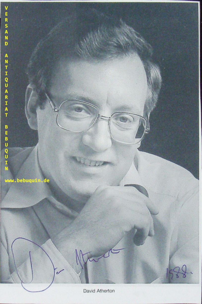 ATHERTON, David (Dirigent): eigenhändig signierte und datierte Portraitseite. München (Philharmonie), 1988. 18 x 12 cm. 1 Bl. seltenes Autogramm. David Atherton (* 3. Januar 1944, Blackpool) ist ein britischer Dirigent. Er wurde bereits 1968 von Georg Solti zum Dirigenten des Royal Opera House Covent Garden ernannt. Gleichzeitig war Atherton auch als Dirigent und musikalischer Leiter der von ihm gegründeten London Sinfonietta tätig. Er galt schon zu dieser Zeit als ein bedeutender Vertreter der Neuen Musik. Im Opernhaus Covent Garden feierte er große Erfolge und prägte dadurch das Londoner Musikleben. (Wikipedia)
