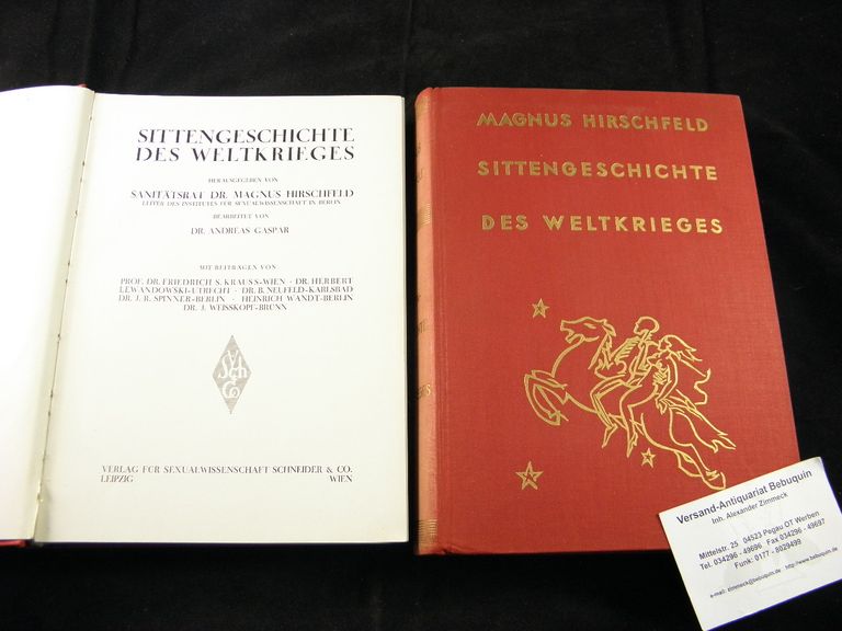 HIRSCHFELD, Magnus: (Hrsg.) Sittengeschichte des Weltkrieges. Bearb. von Andreas Gaspar. 2 Bände. Leipzig, Wien (Schneider), 1930. Gr. 8°. XX, 415(1) S., 445 S., 1 Bl. mit zahlr. teils farb. Abbildungen auf Tafeln und im Text. OLn. mit Goldprägung. Rücken geblichen, sonst gutes Exemplar. EA.