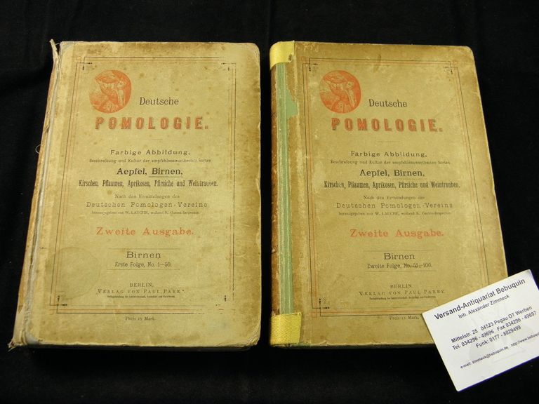 POMOLOGIE.– LAUCHE, W(ilhelm): (Hrsg.) Deutsche Pomologie. Birnen. Erste und Zweite Folge. Chromolithographische Abbildung, Beschreibung und Kulturanweisung der empfehlenswerthesten Sorten Aepfel, Birnen, Kirschen, Pflaumen, Apricosen, Pfirsiche und Weintrauben. Nach den Ermittelungen des Deutschen-Pomologen-Vereins. 2. Ausgabe. 2 Bände. Berlin (Parey), 1882/83. Gr. 8°. 204 Doppelseiten Text und 100 chromolithografische Tafeln auf Karton. ill. OHLn mit bedruckten Innendeckeln. Einband stärker gebräunt, Rücken angeplatzt und teils fixiert, innen im Textteil gelegentlich stockfleckig, die Tafeln nur vereinzelt betroffen. EA mit den herrlichen Bildtafeln von ganzen und halben Früchten, sowie Knospen, Blüten und Blütenblättern.