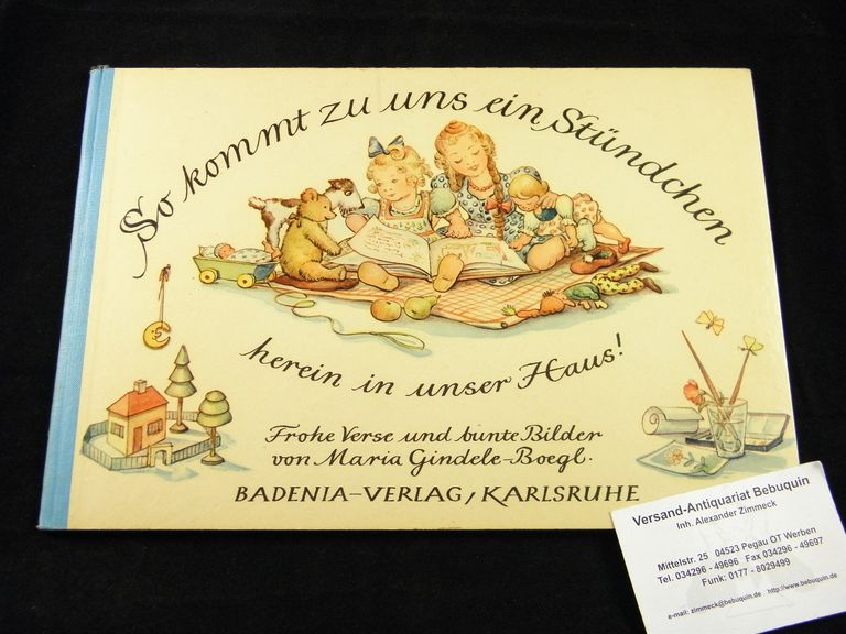 GINDELE-BOEGL, Maria: So kommt zu uns ein Stündchen herein in unser Haus. Frohe Verse und bunte Bilder. Karlsruhe (Badenia), (1950). Quer 4°. 8 Bl. mit farb. Illustrationen der Pforzheimer Malerin. farb. ill. OHLn. schönes Ex. sehr seltene EA dieses schönen Kinderbuchs. Mück 5725.
