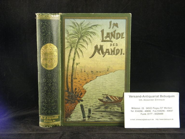 MAY, Karl: Im Lande des Mahdi. III. Band. 6.– 10. Tsd. Freiburg (Fehsenfeld), 1896. 571 (1) S. farb. ill. OLn. (DB 68). etwas schief gelesen, Kanten berieben, Schnitt angeschmutzt, gutes Ex. mit leuchtendem Rückengold. = Gesammelte Reiseerzählungen, Bd. XVIII. Plaul 280.2.