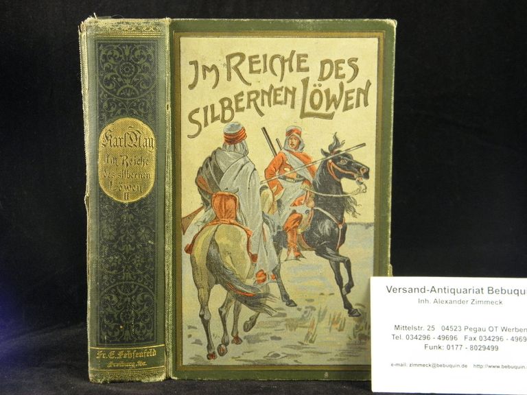 MAY, Karl: Im Reiche des silbernen Löwen. II. Band. Reiseerlebnisse. 26.– 30. Tsd. Freiburg (Fehsenfeld), (1905). 628 (4) S. ill. OLn. (DB 80). etwas schief gelesen, Kanten stärker berieben, Rückenschild etwas gebräunt. = Gesammelte Reiseerzählungen, Bd. XXVII. Plaul 309.4.