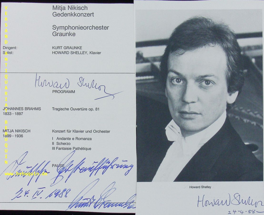 SHELLEY, Howard (Pianist) + GRAUNKE, Kurt (Dirigent): eigenhändig von beiden signierte und datierte Programmseite. Anbei die signierte Portraitseite von Shelley (leicht beschnitten) München (Philharmonie), 14.4.1988. 19,5 x 11 cm. 3 Bl. Howard Gordon Shelley (born 9 March 1950) is a British pianist and conductor. He was educated at Highgate School and the Royal College of Music. He is married to fellow pianist Hilary Macnamara, with whom he has performed and recorded in a two-piano partnership, and they have two sons. Kurt Karl Wilhelm Graunke (* 20. September 1915 in Stettin; † 5. Juni 2005 in München) war ein deutscher Komponist und Dirigent sowie Gründer und Leiter des Symphonie-Orchesters Graunke, das 1990 in Münchner Symphoniker umbenannt wurde. (Wikipedia)