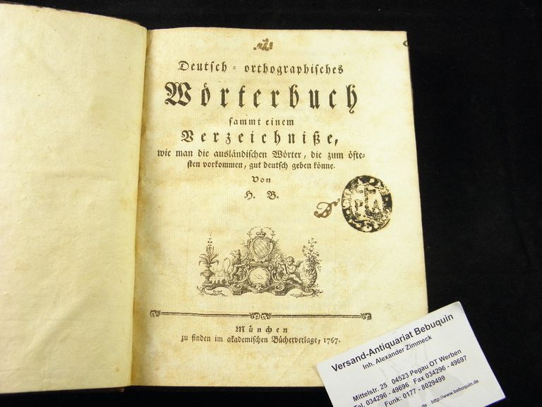 WÖRTERBÜCHER.– (BRAUN, Heinrich:) Deutsch-orthographisches Wörterbuch sammt einem Verzeichniße, wie man die ausländischen Wörter, die zum öftesten vorkommen, gut deutsch geben könne. München (akademischer Buchverlag), 1767. 6 Bll., 364 S., 4 Bll. mit sehr vielen gestochenen auch figürlichen Vignetten und Buchschmuck.. HLdr der Zeit auf 6 Bünden mit roten geprägtem Rückenschild. handschriftliches Ex libris von Bernard Gangler aus dem Jahr 1768 auf Innendeckel. Sehr feines Ex. Erste Ausgabe. – Holmann/B. IV, 12780. – Heinrich Braun (1732 – 1792) trat 1750 nach seinem Studium in den Benediktinerorden ein und studierte am Studium generale in Rott/Inn, wo er 1756 promoviert wurde. 1758-62 war er Gymnasiallehrer in Freising, anschließend Professor der Theologie und Bibliothekar in Tegernsee. 1767 wurde Heinrich Braun Kanonikus am Münchner Liebfrauenstift, 1768 Mitglied des Kurfürstlichen Geistlichen Rats und war 1770-73 Landeskommissar für das gesamte bayerische Volksschulwesen. 1777 wurde er Direktor sämtlicher Lyzeen, Gymnasien, Stadt- und Landesschulen, 1778 Leiter des gesamten Schulwesens in Bayern. Die von ihm angestrebte Schulreform umfaßte die allgemeine Schulpflicht, festumrissene Lehrpläne, moderne pädagogische Ansätze sowie die Hebung des Lehrerstandes.