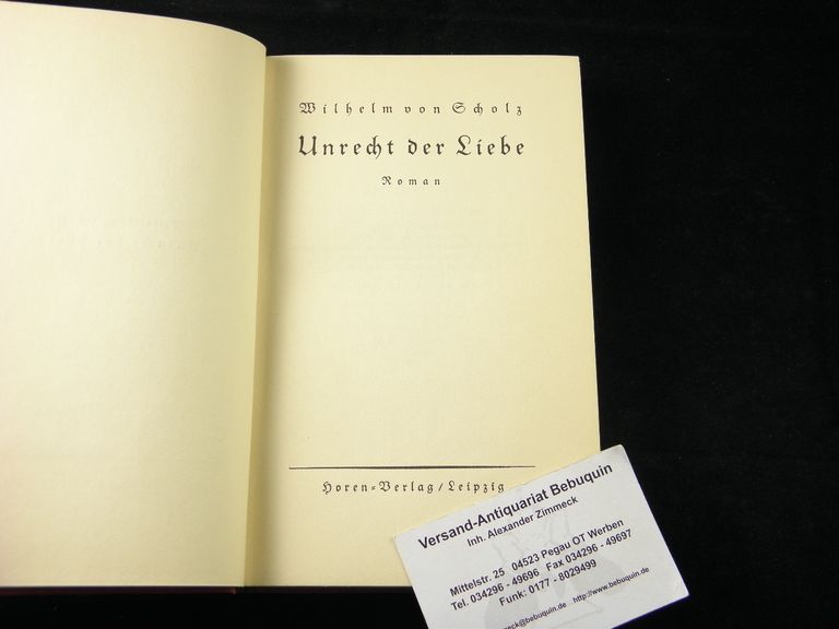 SCHOLZ, Wilhelm von: Unrecht der Liebe. Roman. Leipzig (Horen), 1931. 249 (2) S. OLn. Rücken geblichen, Ex libris auf Innendeckel. EA mit einer eigenhändigen auf Silvester 1931 datierten Verfasserwidmung an den Dichter Wolf Schwarzenberg auf Vorsatz. WG² 97.