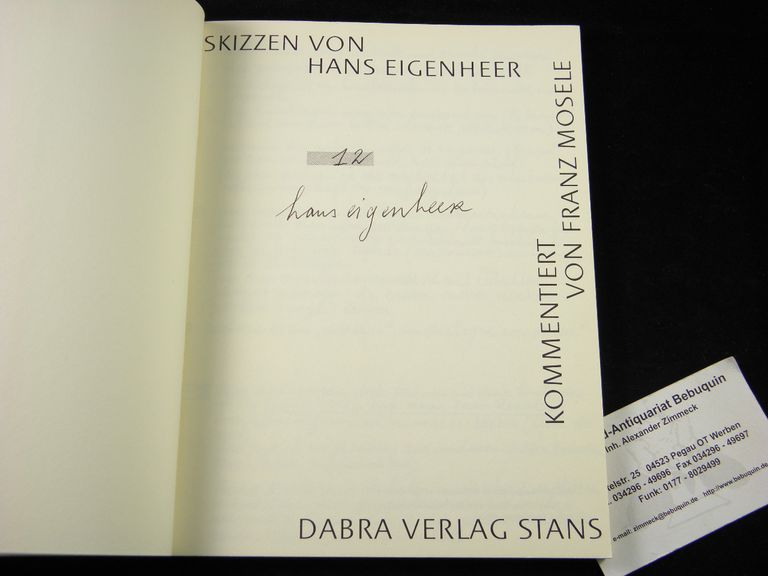 EIGENHEER.– MOSELE, Franz: Skizzen von Hans Eigenheer. Stans (Dabra), 1973. Gr. 8°. 52 S. mit Zeichnungen von Hans Eigenheer. ill. OKart. feines Ex. Nr. 12 von 500 Ex. der EA mit der Signatur des Zeichners auf Titelseite.
