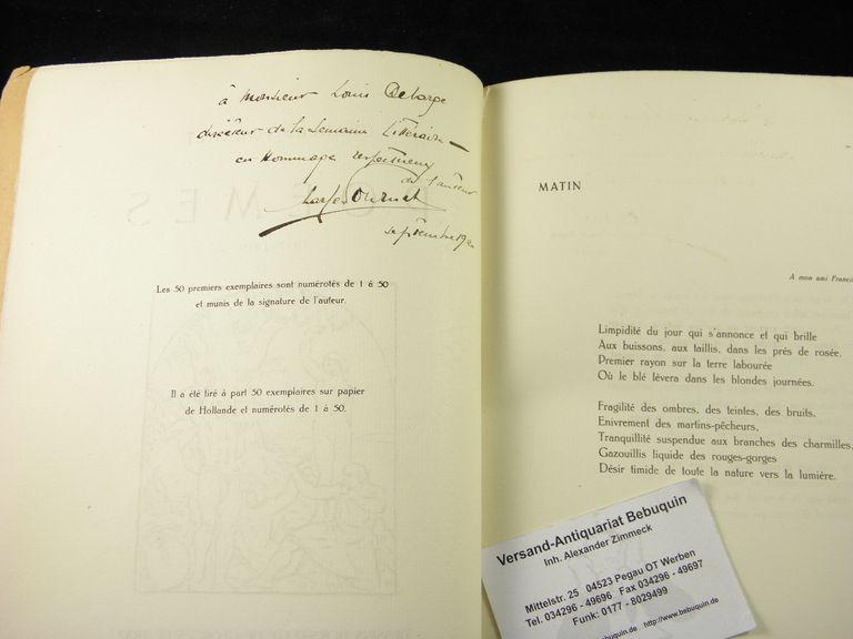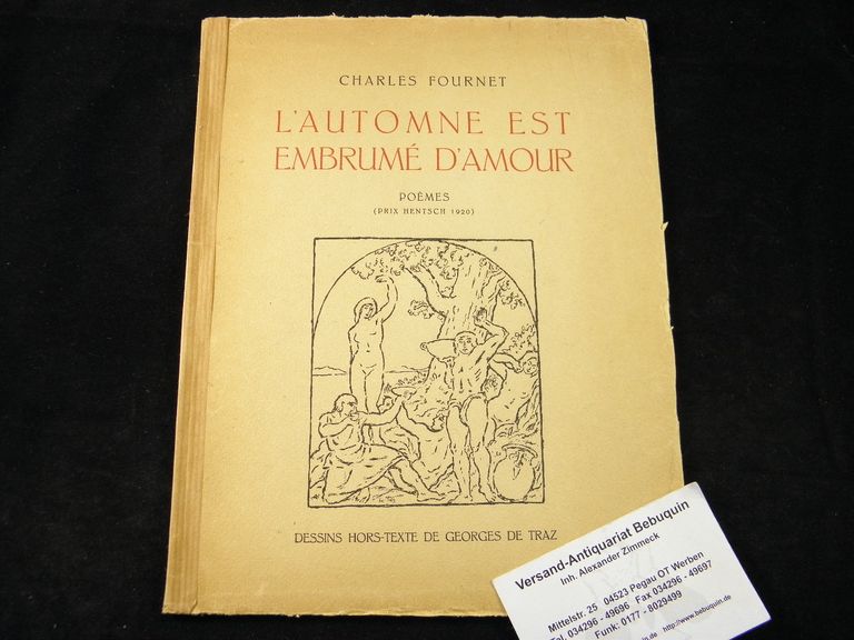 FOURNET, Charles: L’automne est embrumé d-Amour. Poemes (Prix Hentsch 1920) o.O. (o.Vlg.) 1920. Gr. 8°. 30 S. mit 4 Textbildern von Georges de Trraz. ill. OKart. Rücken überklebt, Kanten etwas lädiert. Nr. 39 von 50 Ex. der EA mit 6zeiliger eigenhändiger datierter und voll signierter Widmung des Verfassers am Druckvermerk.
