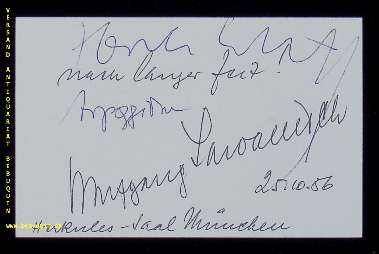 SAWALLISCH, Wolfgang (Dirigent) + SCHIFF, Heinrich (Cellist): eigenhändig von beiden signierte und datierte Autogrammkarte: nach langer Zeit. München (Herkulessaal), 25.19.1986. 8 x 12,5 cm Karteikarte mit Begleitblatt. Wolfgang Sawallisch (* 26. August 1923 in München; † 22. Februar 2013 in Grassau) war ein deutscher Dirigent und Pianist. Heinrich Schiff (* 18. November 1951 in Gmunden; † 23. Dezember 2016 in Wien) war ein österreichischer Cellist und Dirigent. (Wikipedia)
