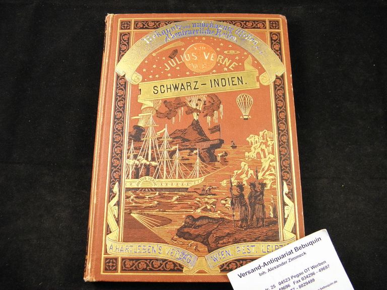 VERNE, Julius: Schwarz – Indien. Wien (Hartleben), 1878. Gr. 8°. 205 (3) S. mit 43 Textabb. OLn. mit reicher Gold- und Schwarzprägung und dreiseitigem Blauschnitt. Kanten und Kapitale leicht berieben, WaV, sonst feines Ex. = Bekannte und unbekannte Welten, Bd. 24. Prachtausgabe. dt. EA. Fromm 26376.