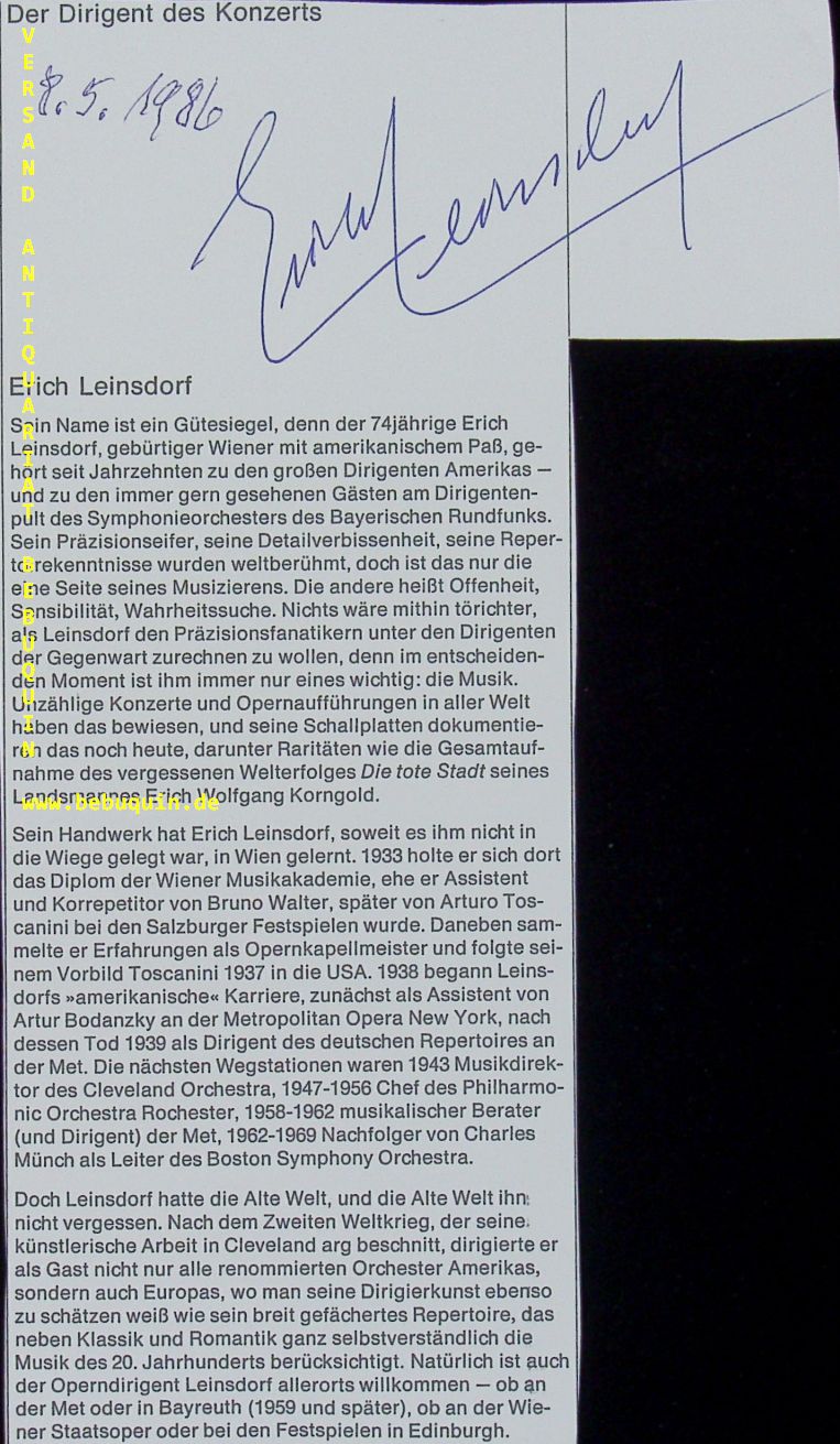 LEINSDORF, Erich (Dirigent): eigenhändig signierte und datierte Portraitseite. München (Philharmonie), 8.5.1986. 23 x 14 cm. 1 Bl. Erich Leinsdorf, geborener Erich Landauer (* 4. Februar 1912 in Wien; † 11. September 1993 in Zürich) war ein österreichisch-US-amerikanischer Dirigent, der ab 1937 vorwiegend in den Vereinigten Staaten lebte. Leinsdorf galt als typischer Operndirigent und wurde in Amerika besonders als Wagner-Dirigent geschätzt. (Wikipedia)