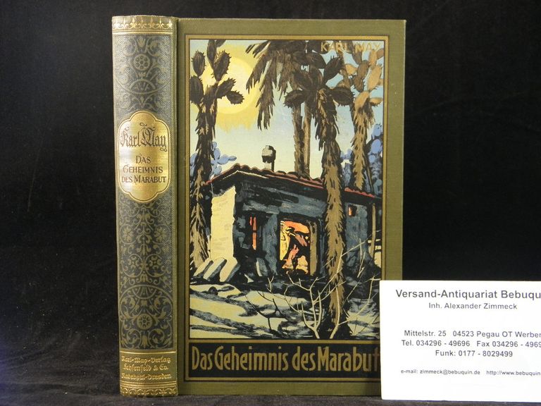 MAY, Karl: Das Geheimnis des Marabut. Hrsg. von E.A. Schmid und Franz Kandolf. Radebeul (Karl May), 1930. 444 (3) S. farb. ill. OLn. farbstarker Einband und goldglänzender Rücken, schönes Ex. = Gesammelte Werke, Bd. 57. EA. Hermesmeier / Schmatz GW 57.1. (2. Teil der 1883 veröffentlichten Erzählung DIE LIEBE DES ULANEN)