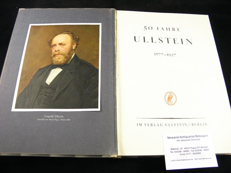 ULLSTEIN.– 50 JAHRE ULLSTEIN.– 1877 – 1927. Berlin (Ullstein), 1927. 4°. 411 S mit zahlr. Abb. + zahlr. mont. Tafeln mit Portraits und Faksimiles. OHLdr mit OSchuber. Schuberkanten etwas berieben, vorderes Gelenk leicht gelockert, insgesamt gut erhalten.