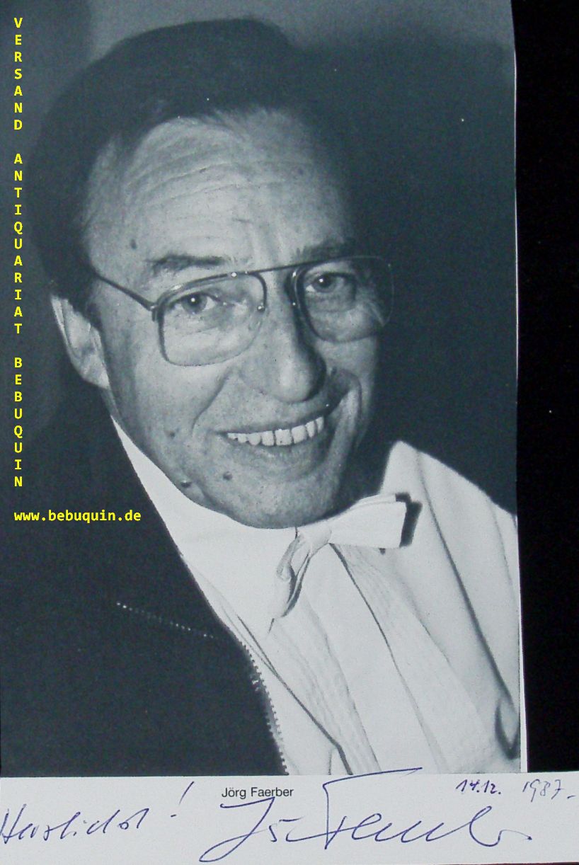 FAERBER, Jörg (Dirigent): eigenhändig signierte Portraitseite: Herzlichst! München (Herkulessaal), 14.12.1987. 19,5 x 11,5 cm. 1 Bl. Jörg Faerber (* 18. Juni 1929 in Stuttgart) ist ein deutscher Dirigent und langjähriger Geschäftsführer des Württembergischen Kammerorchesters Heilbronn. (Wikipedia)