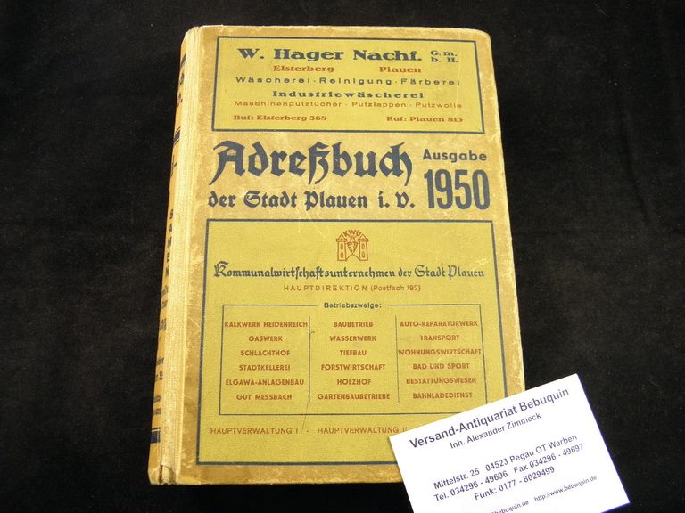 PLAUEN.– ADRESSBUCH DER STADT PLAUEN i. V. 1950.– 48. Aufl. Plauen (Neupert), 1950. 2 Bl. mit Sitzplan des Stadttheaters, 832 S. + Werbeabteilung. ill. OHLn. Einband und Schnitt angeschmutzt, insgesamt noch gut. Sortiert nach Behörden, Einwohnern, Straßen, Geschäften und Eingemeindungen.