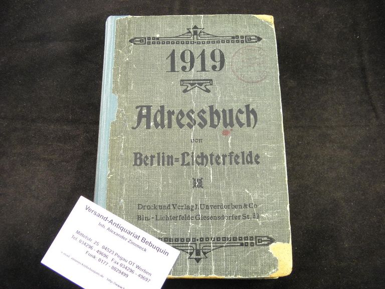 BERLIN.– ADRESSBUCH VON BERLIN – LICHTERFELDE 1919.– 19. Jg. Berlin (Unverdorben), 1919. 6 Bl. Werbung, 3 Bl., 36, 248, 184, 24, XX S. OHLn mit neu aufgezogenem alten Rücken. Ecken berieben, Gelenke stabilisiert, insgesamt fein restauriertes Ex. sehr seltenes Adressbuch.