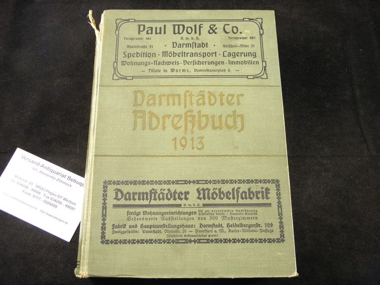DARMSTADT.– ADRESSBUCH DER HAUPT- UND RESIDENZSTADT DARMSTADT 1913.– Einschließlich der mit Darmstadt seit dem 1. April 1888 vereinigten vormaligen Gemeinde Bessungen. Nebst Geschäfts- und Handelsregister von Darmstadt, Arheiligen, Eberstadt, Griesheim, hahn, Nieer-Ramstadt, Ober-Ramstadt, Pfungstadt und Roßdorf. Darmstadt (Bergsträßer), 1913. Gr. 8°. 7 Bl., 779, 55 S. mit zahlr Abb. ill. OLn. oberes Kap fachmännisch restauriert, sonst gut erhalten. Seltenes Adressbuch mit der Sortierung nach Einwohner, Straßen, Branchen und Behörden. Beiliegend der „Nachtrag zum Adressbuch Darmstadt 1913“ mit 24 S. Enthält die Berichtigungen welche mit zum 31. Januar 1913 entstanden sind.
