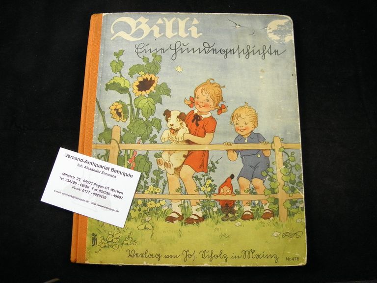 BAUMGARTEN.– IPF: (d.i.: Hermann Siegmann) Billi. Eine Hundegeschichte. Mainz (Jos. Scholz), (1938). 4°. 8 Bl. (einschl. Titelblatt) mit durchweg farb. Bildern und farb. Vorsatzbildern von Fritz Baumgarten. farb. ill. OHLn. Kanten etwas berieben, Widmungsseite sehr akkurat im Erscheinungsjahr ausgefüllt. Sehr seltene EA dieses Bilderbuchs. Blaume 176. Einband und Titel in Sütterlin.