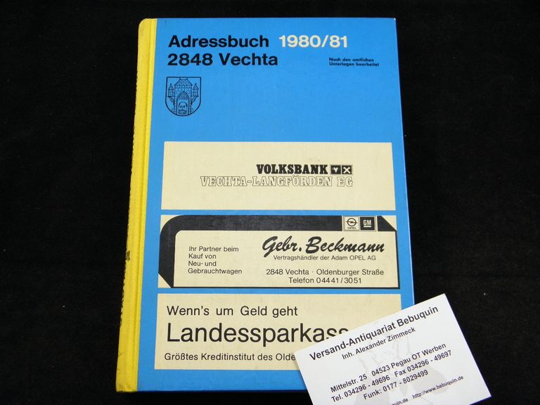 VECHTA.– STADTADRESSBUCH VECHTA 1980/81.– .– Nach amtlichen Unterlagen und verlagseigenen Erhebungen bearb. Oldenburg (Kommunikation und Wirtschaft), 1980. 52, 130, 73, 18 S. mit Zwischenpappen. ill. OHLn. sehr gut erhalten. seltenes Adressbuch.