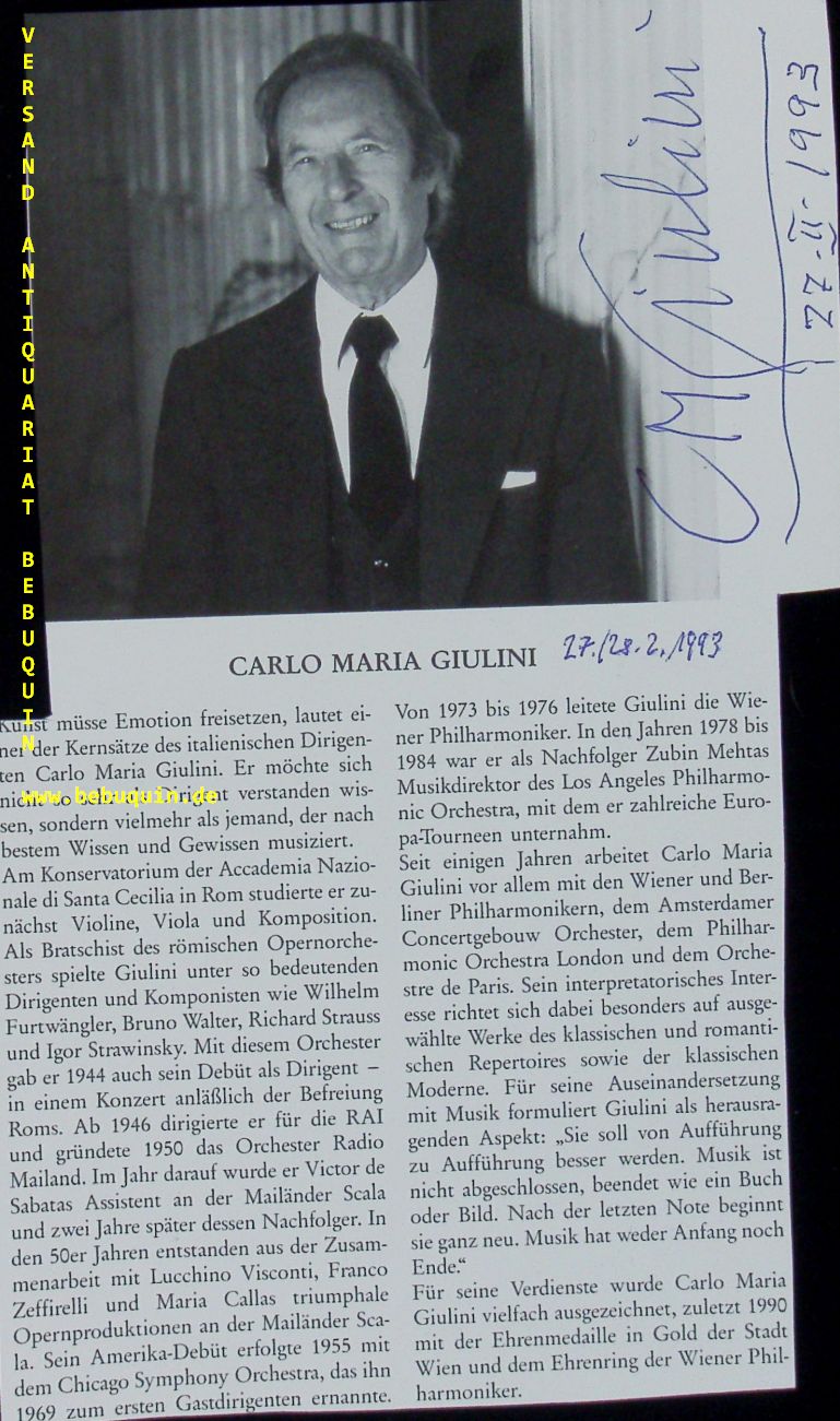 GIULINI, Carlo Maria (Dirigent): eigenhändig signierte und datierte Programmheftseite. München (Philharmonie), 27.2.1993. 1 Bl. Carlo Maria Giulini (* 9. Mai 1914 in Barletta, Provinz Barletta-Andria-Trani; † 14. Juni 2005 in Brescia, Lombardei) war ein italienischer Dirigent. (Wikipedia)