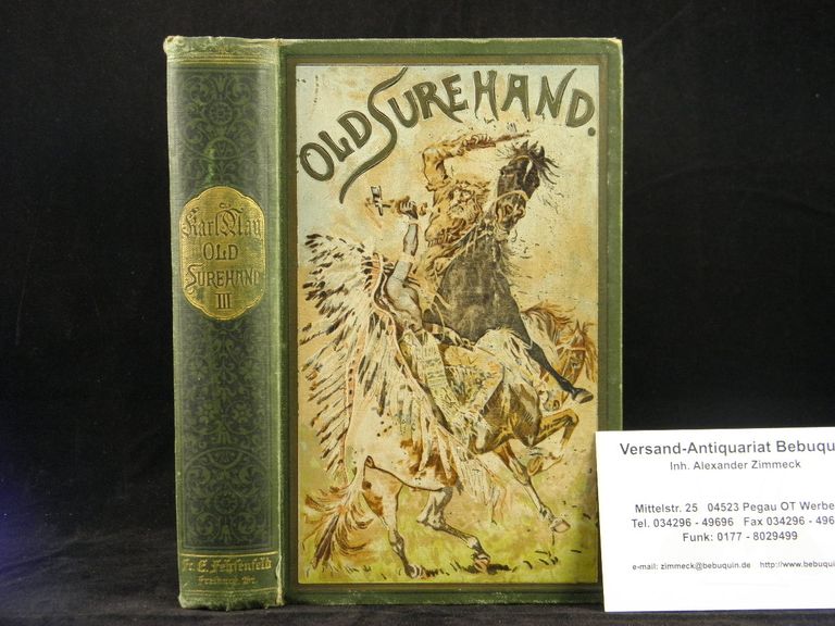 MAY, Karl: Old Surehand. 3. Band. Reiseerlebnisse. 21.– 25. Tsd. Freiburg (Fehsenfeld), (1899). 566 S. mit dem Portrait Old Shatterhands. farb. ill. OLn. (DB 66). Einband leicht geblichen, Ecken angestoßen, Portraittafel auf der Rückseite bekritzelt. = Gesammelte Reiseerzählungen, Bd. XIX. einzige Auflage mit Verlagssignet auf Titel und Reihentitel. Plaul 286.3.