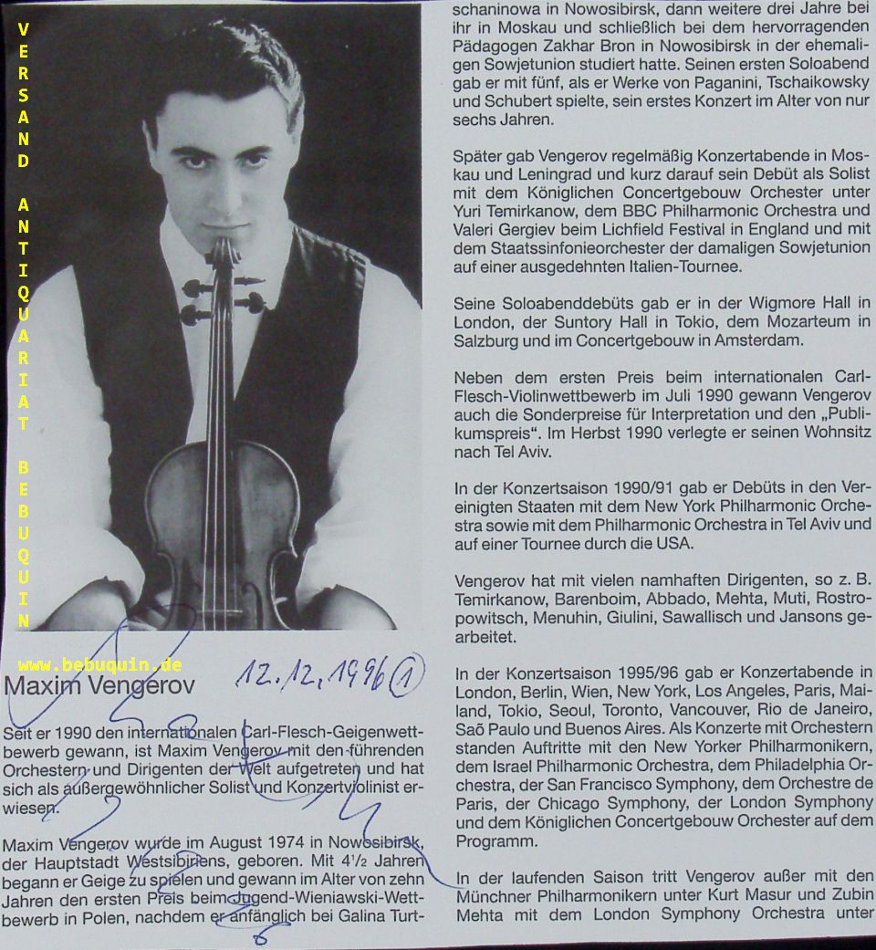VENGEROW, Maxim (Violinist): eigenhändig als Maxim signierte und datierte Portraitseite. München (Herkulessaal), 12.12.1996. 18 x 16,5 cm. 1 Bl. Maxim Vengerov (* 15. August 1974 in Nowosibirsk) ist ein in Deutschland lebender russisch-israelischer Geiger, Musikpädagoge und seit 2006 Träger des Saarländischen Verdienstordens. (Wikipedia)